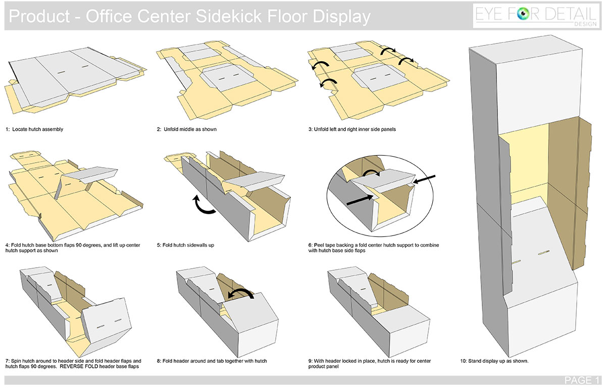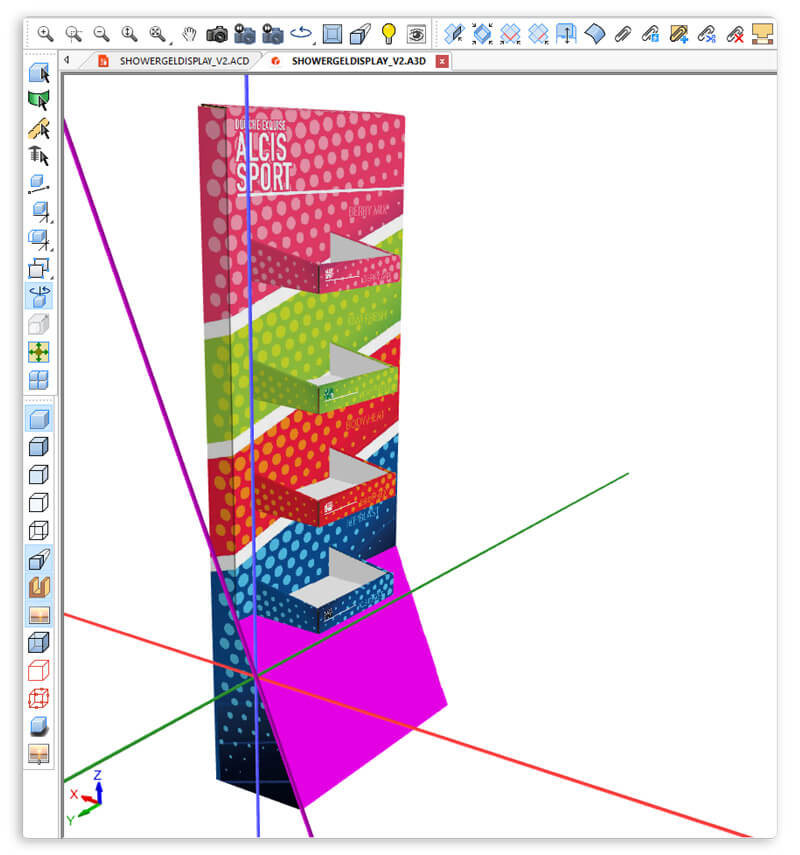 Design in 3D around the primary products. Fill display shelves with products then select a resizable display design template from the library. The 2D structure is automatically created using 3D scene data and multiple views are auto-created, including planograms. This can SAVE HOURS of design time!