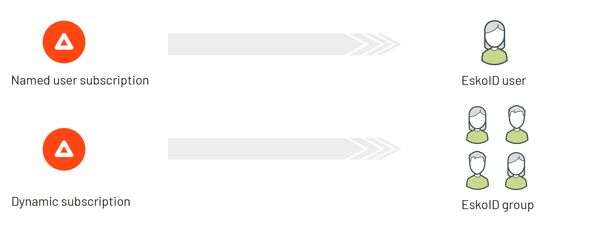 Las suscripciones de usuario con nombre siguen nuestro modelo de licencias tradicional, que gestiona estas en función del usuario con nombre en esa cuenta En comparación con estas, las Dynamic Subscriptions administran las licencias entre equipos y grupos de la cuenta.