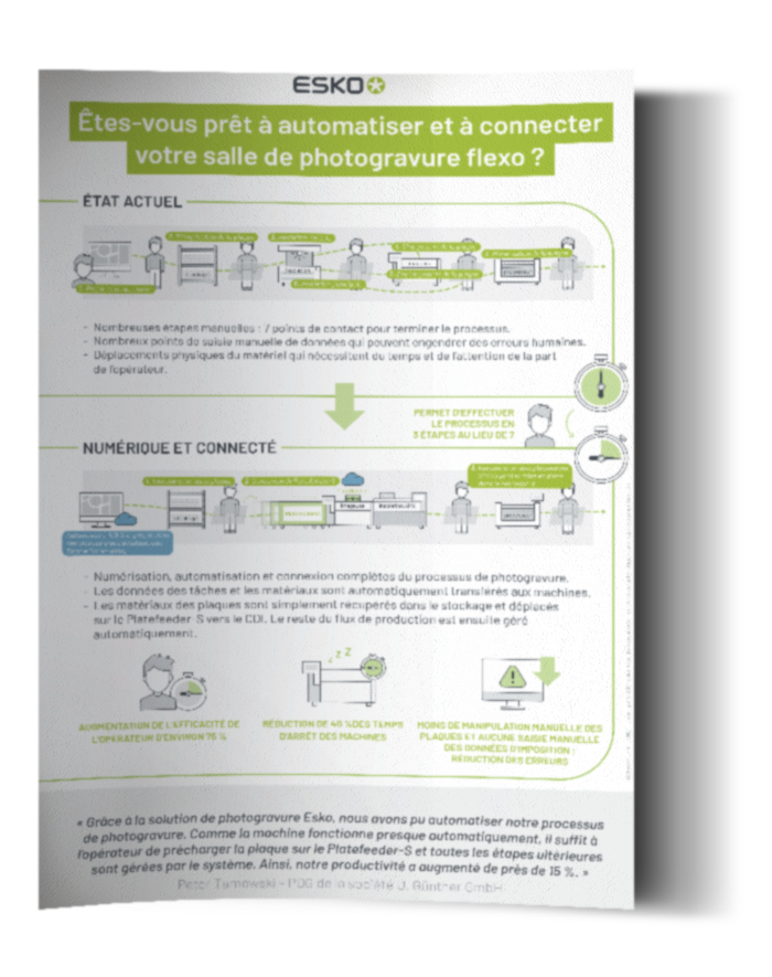 Si vous avez l’habitude des travaux de dernière minute de qualité incohérente, vous n’êtes pas seul. Les processus traditionnels de fabrication de plaques flexo en plusieurs étapes sont susceptibles de provoquer des erreurs et des retouches, réduisent le temps de disponibilité de votre presse et, en fin de compte, nuisent à la productivité et à la rentabilité de vos opérations. Mais nous avons une bonne nouvelle pour vous ! Il est facile de créer des processus de photogravure flexo modernes et rationalisés de nouvelle génération !