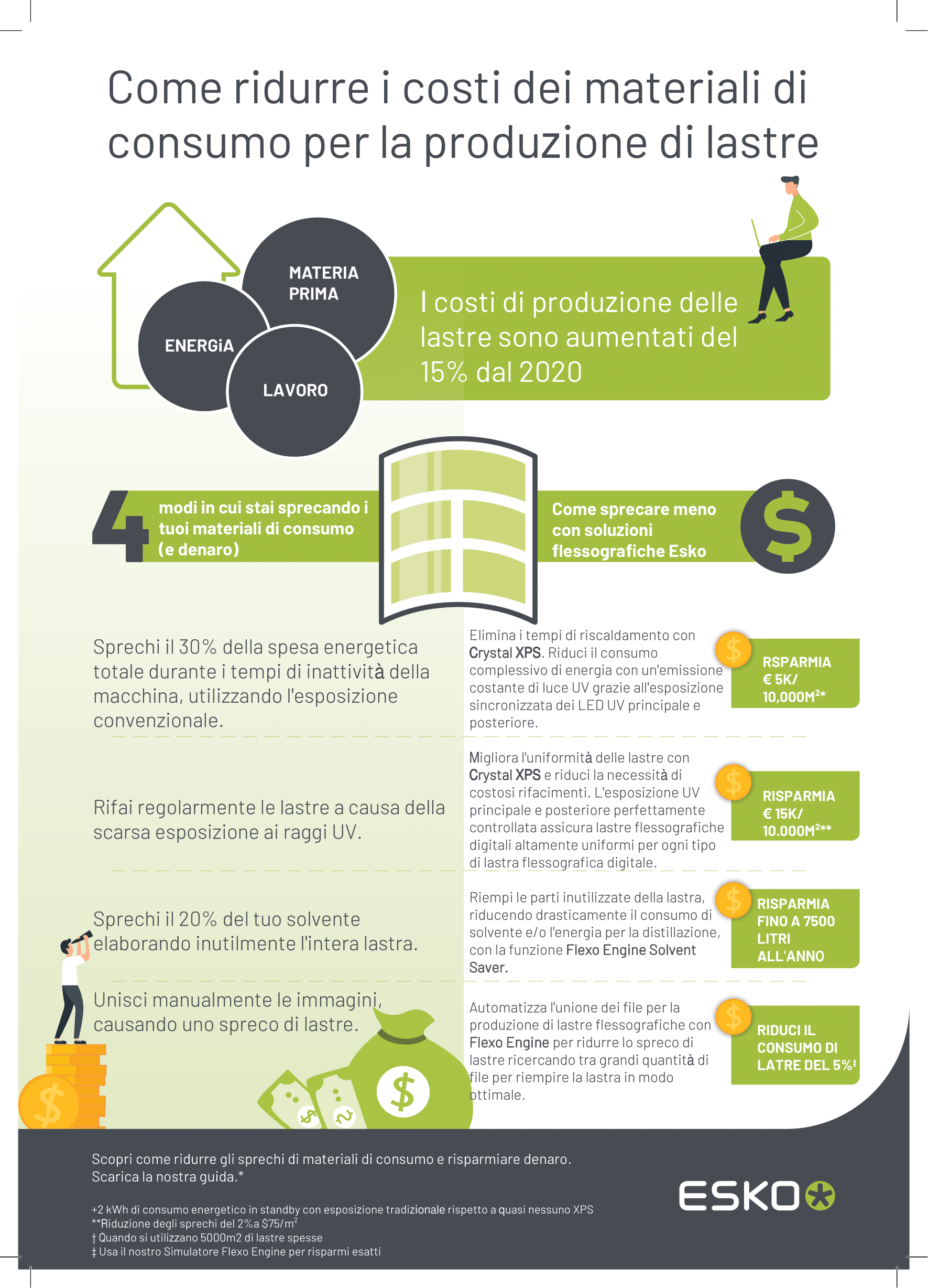 Scopri come le nostre innovazioni possono aiutare la tua azienda a ridurre il costo dei materiali di consumo nella produzione di lastre flessografiche e nella stampa con la nostra infografica.